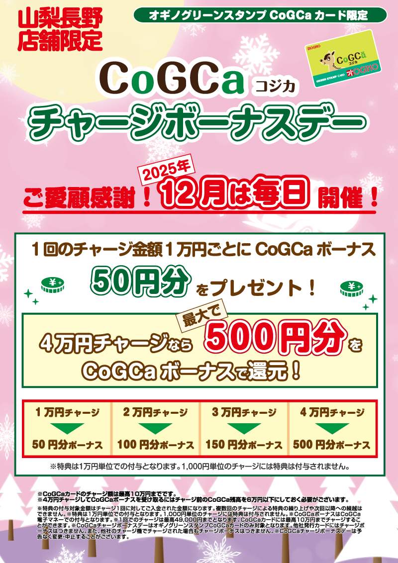 【山梨長野版】オギノCoGCa電子マネー☆チャージボーナス