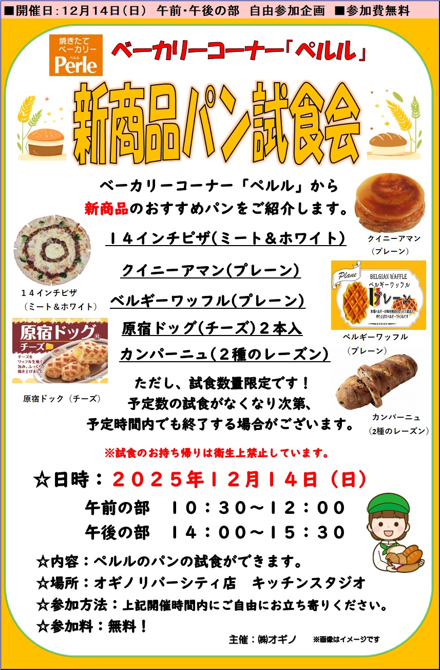 【2025/12/14(日)開催】ベーカリーコーナー「ペルル」新商品パン試食会