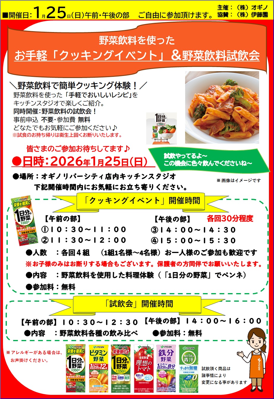【2026/1/25(日)開催】 野菜飲料を使ったクッキングイベント&野菜飲料試飲会
