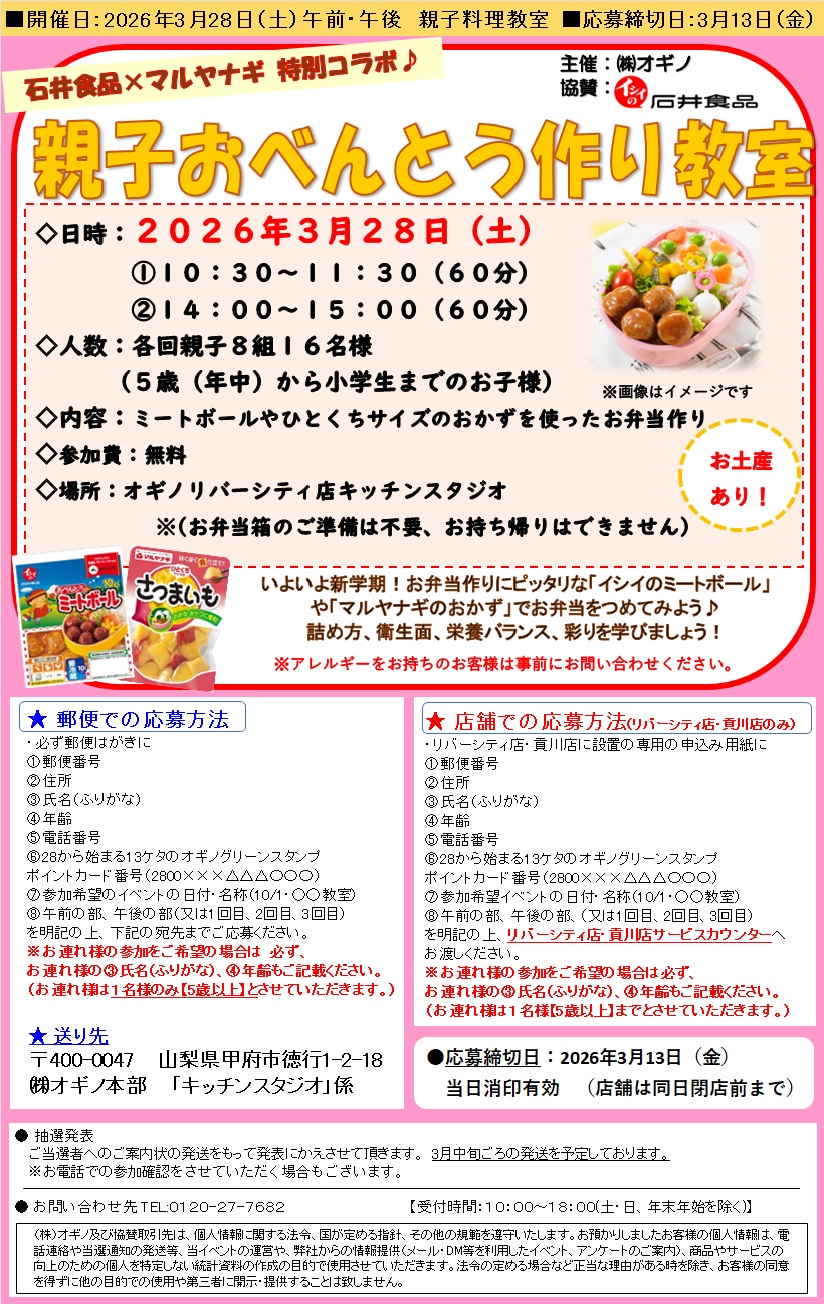 【2026/3/28(土)開催】 親子おべんとう作り教室